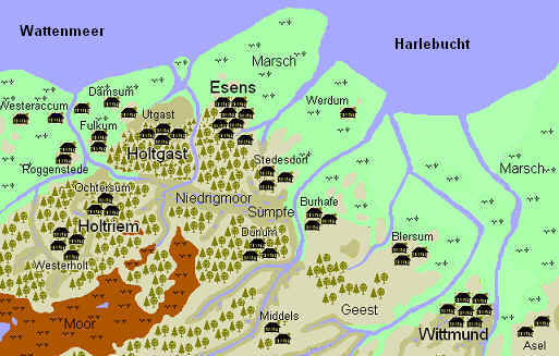 Im Jahre "0" könnte die Küstenlinie im Bereich des Harlingerlandes einen ähnlichen Verlauf genommen haben wie auf dieser Skizze. Da Deiche Meer und Land noch nicht voneinander trennten, konnte sich damals das Wasser bei jeder Flut ungehindert auf tiefer liegende Gebiete im Landesinneren ausbreiten. Hier ist auch deutlich die besonders günstige Lage der Gemeinde Holtgast mit den Ortsteilen Damsum, Fulkum und Utgast zu sehen, die schon zu einer sehr frühen Besiedlung führte. |